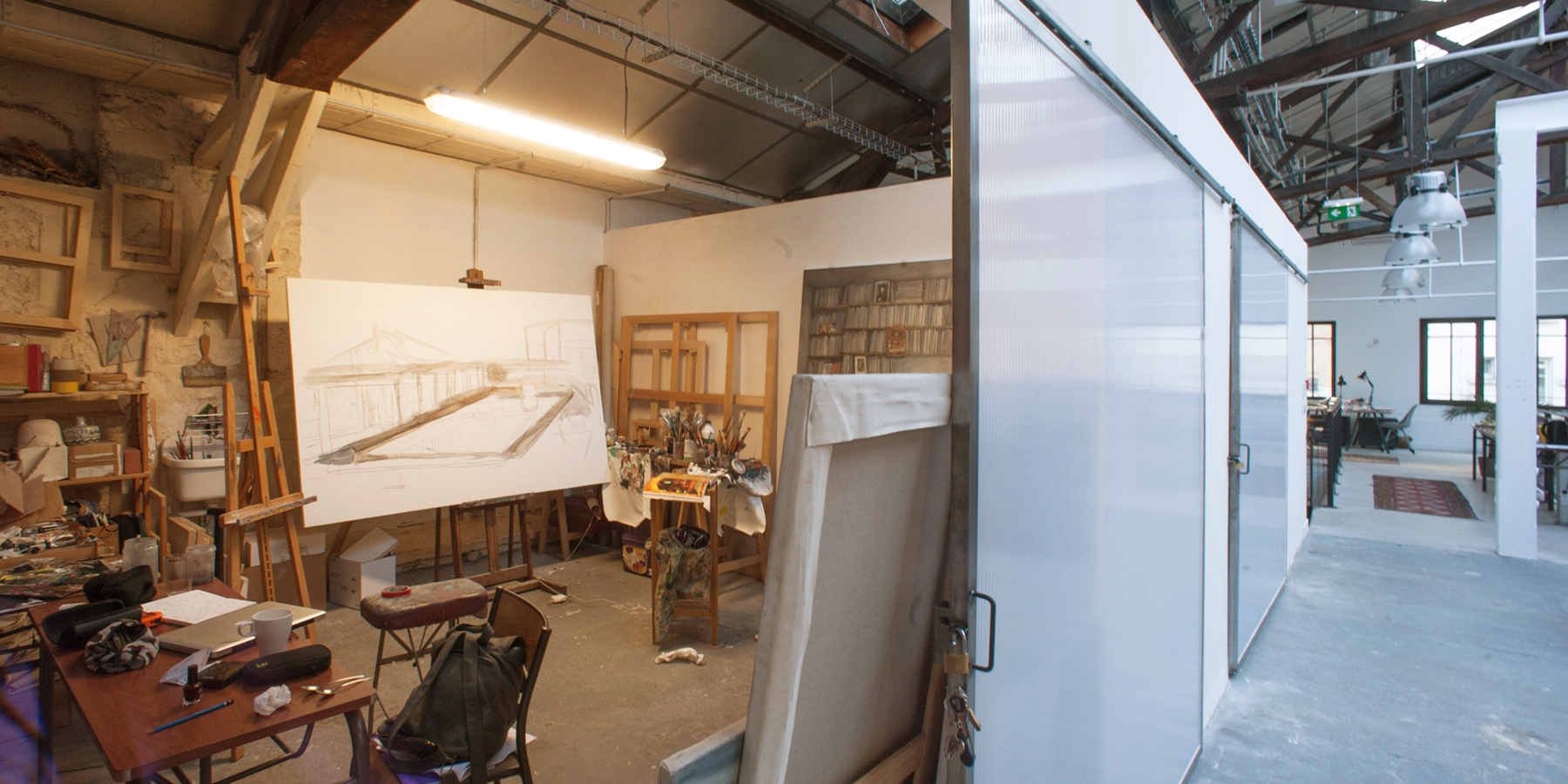 Les ate­liers font par­tie de l’écosystème du Onzième Lieu : les artistes intègrent une com­mu­nau­té de rési­dents – artistes, entre­pre­neurs et tra­vailleurs indé­pen­dants – qui occupent le cowor­king voi­sin sous la ver­rière. Un ser­vice de res­tau­ra­tion est dis­po­nible sur place, au Petit Comp­toir au rez de chaussée.